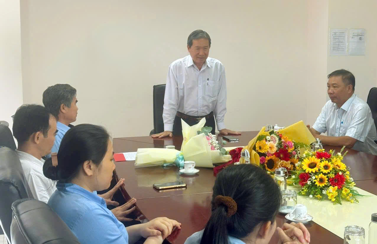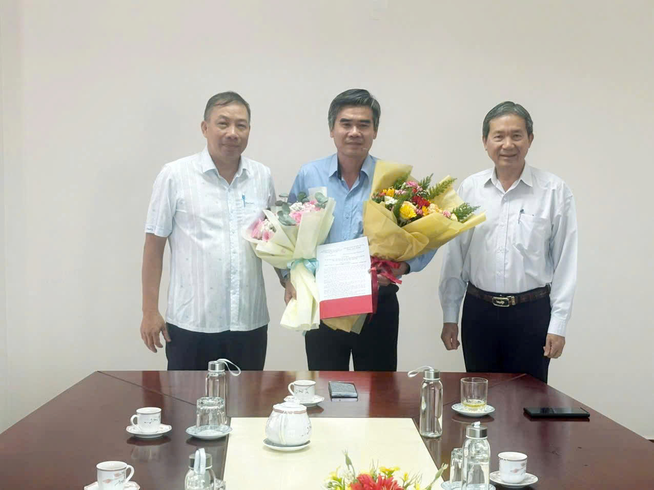 Đồng chí Nguyễn Phương Đông và đồng chí Đinh Ngọc Hòa trao quyết định và tặng hoa chúc mừng đồng chí Hồ Hơn Nhơn