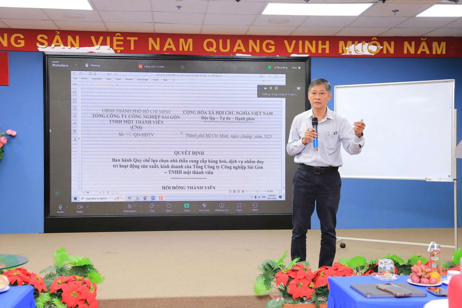 Ngày 6/11, Tổng Công ty Công nghiệp Sài Gòn TNHH MTV đã tổ chức Hội nghị trực tiếp và kết hợp trực tuyến “Hướng dẫn triển khai Quy chế lựa chọn nhà thầu cung cấp hàng hóa, dịch vụ nhằm duy trì hoạt động sản xuất, kinh doanh của Tổng Công ty Công nghiệp Sài Gòn TNHH MTV”. Tham dự có các đồng chí: Trần Phi Long, Bí thư Đảng ủy, Chủ tịch HĐTV Tổng Công ty; Nguyễn Phương Đông, Phó Bí thư Đảng ủy, Tổng Giám đốc Tổng Công ty. Cùng dự và đồng thời là báo cáo viên hội nghị có ông Nguyễn Đắc Toàn, Giảng viên Trung tâm tư vấn đấu thầu và Hỗ trợ đầu tư, Sở Tài chính TPHCM.