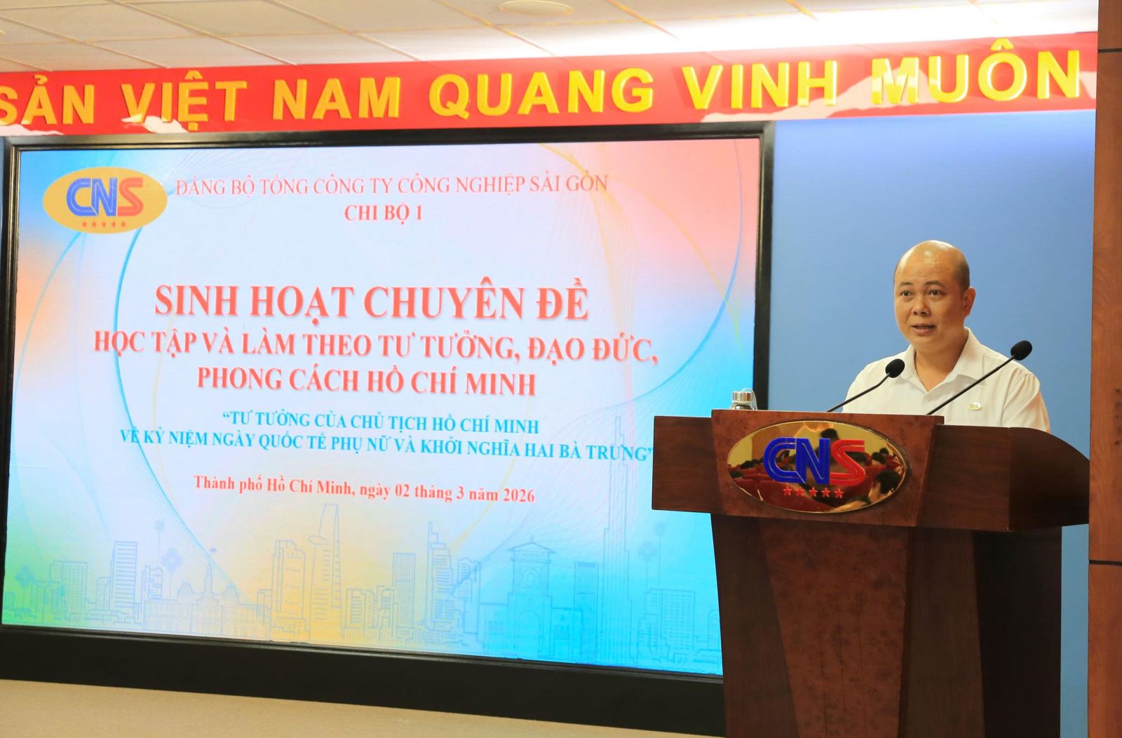 Ngày 02/03, Đảng bộ Tổng Công ty Công nghiệp Sài Gòn TNHH Một thành viên (CNS) đã tổ chức sinh hoạt chuyên đề học tập và làm theo tư tưởng, đạo đức, phong cách Hồ Chí Minh với chủ đề “Tư tưởng của Chủ tịch Hồ Chí Minh về kỷ niệm ngày Quốc tế Phụ nữ 8/3 và cuộc khởi nghĩa Hai Bà Trưng. Tham dự có các đồng chí: Trần Phi Long, Bí thư Đảng ủy, Chủ tịch HĐTV Tổng Công ty; Nguyễn Phương Đông, Phó Bí thư Đảng ủy, Tổng Giám đốc Tổng Công ty cùng các đồng chí trong Ban Thường vụ Đảng ủy, Hội đồng thành viên, Ban Điều hành Tổng Công ty.